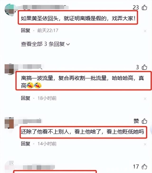 评论区更是笃定,要是圣依真的吃了这颗回头草,那他们的离婚就是假的,是为了流量将粉丝耍得团团转的骗局。